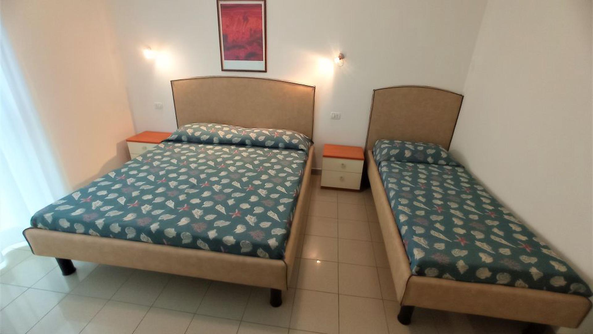 The three-room apartments for 7 people in the new Villa Lucchese consist of a large living room with sofa bed and kitchenette, a double bedroom, second bedroom with double bed elected single, bathroom with shower, large terrace equipped with tables and chairs. Villa Lucchese is a newly built residence, inspired by the famous Dutch painter Mondrian, all apartments are equipped with separate air-conditioning in every room, satellite TV, new modern furniture, security door, parking, wi-fii, intercom, at last floor there is a large terrace with sunbeds and deck chairs.
